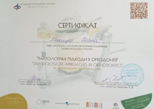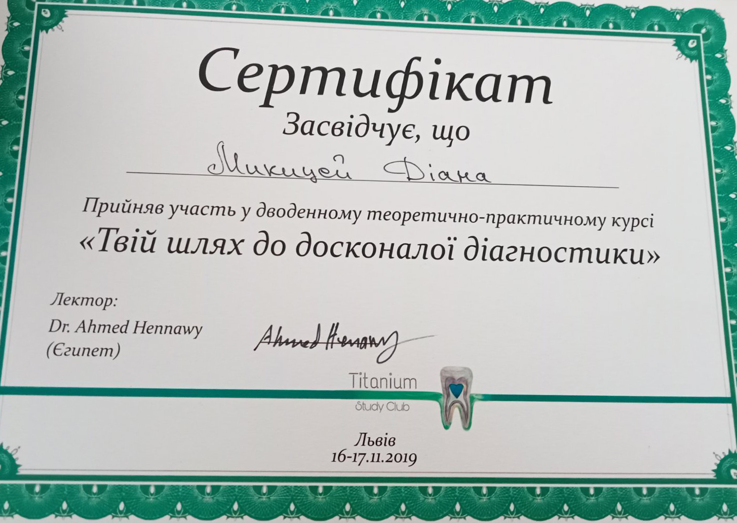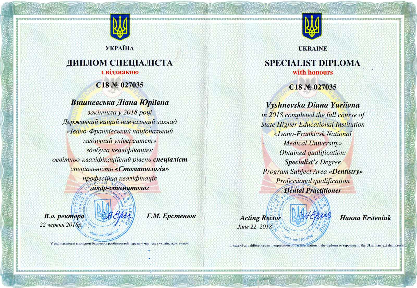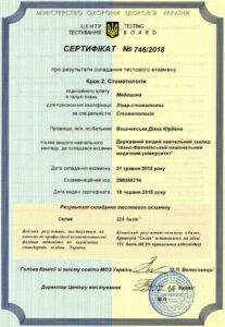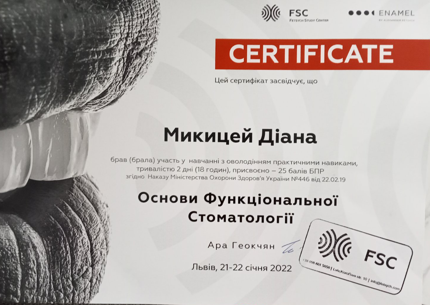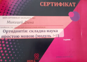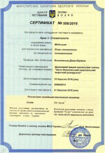 - Інтернатура за спеціальністю «Стоматологія» (2018–2020 рр.)