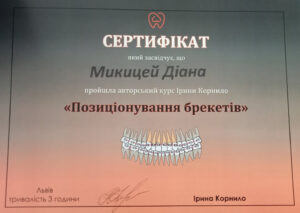 Діана Юріївна — спеціаліст з 5-річним досвідом у сфері ортодонтії, яка допомагає пацієнтам досягати ідеальної усмішки за допомогою сучасних технологій та індивідуального підходу. Вона постійно вдосконалює свої знання, відвідуючи професійні курси провідних фахівців, і впроваджує новітні методики у практику.